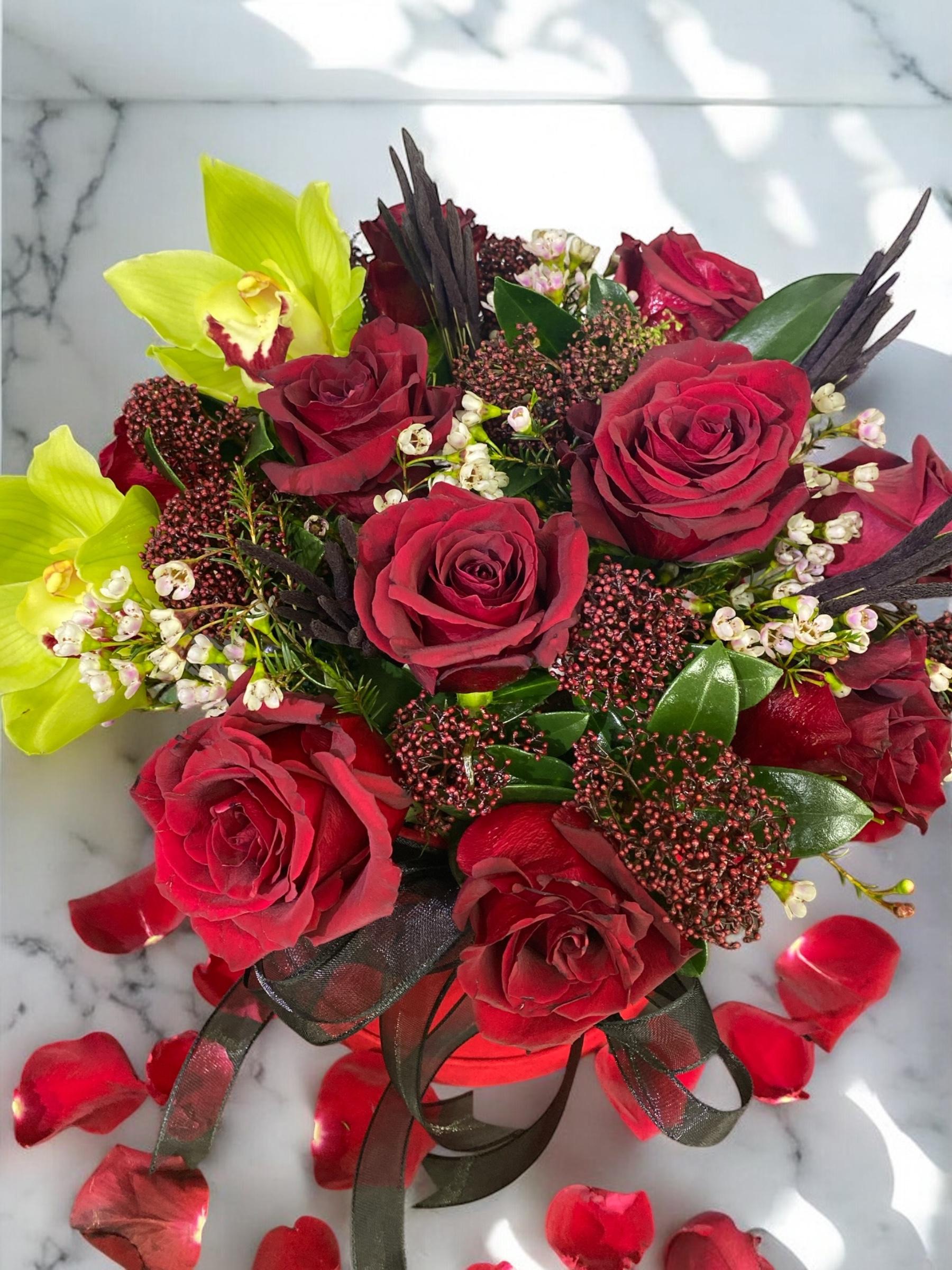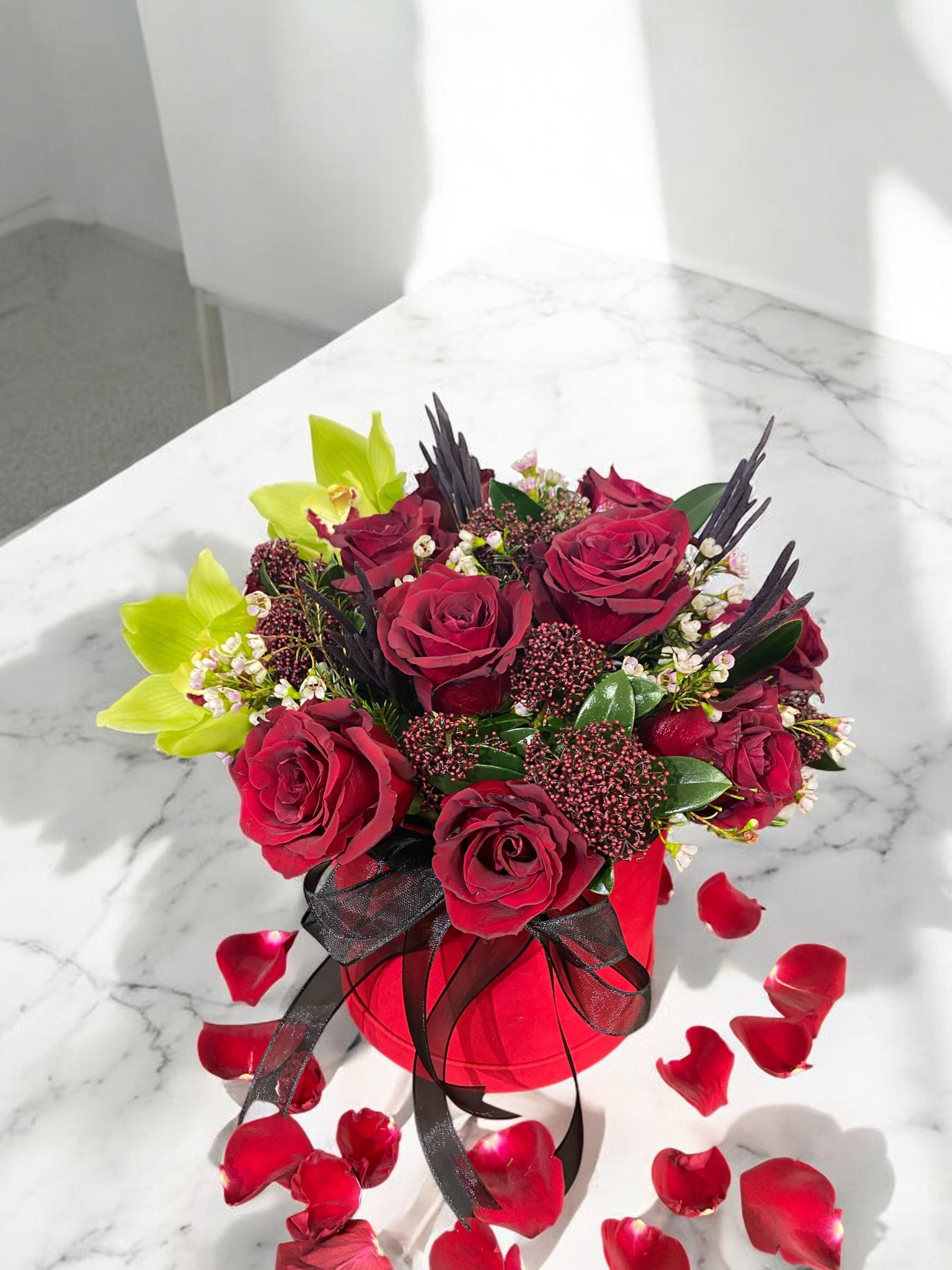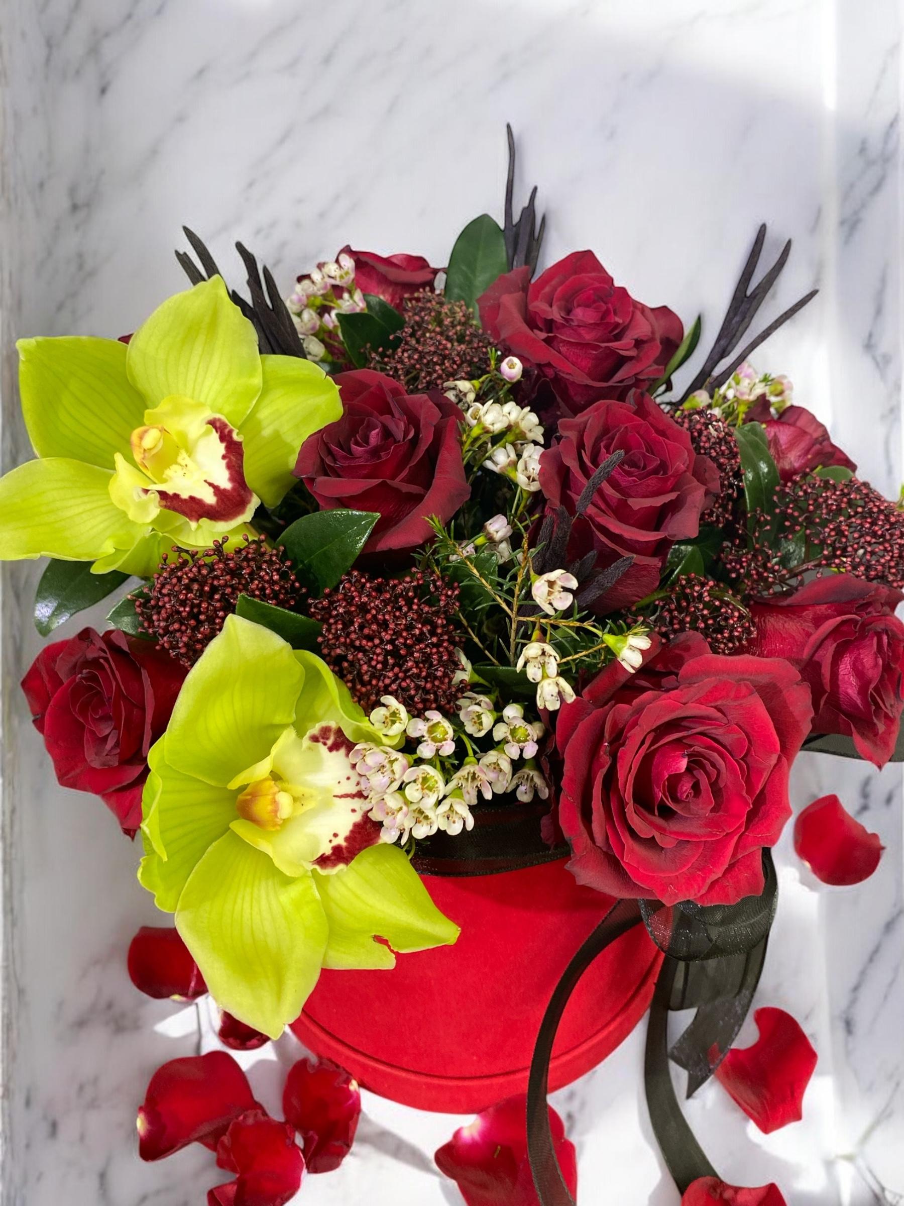 Bu muhteşem  Lüx Kırmızı Kutu, 10 adet ithal butik kırmızı gül ve 3 adet cymmidium orkide ile süslüdür. Ayrıca, 6 adet taptaze skımmıa yeşillik ve 10 adet chamelacium yeşilliği ile tamamlanmıştır. Kutuda bulunan her bir çiçek, görsel bir şölen yaratmaktadır. Bu zarif ve lüks kutuda çiçekler, sevdiklerinizi mutlu etmek için mükemmel bir seçimdir