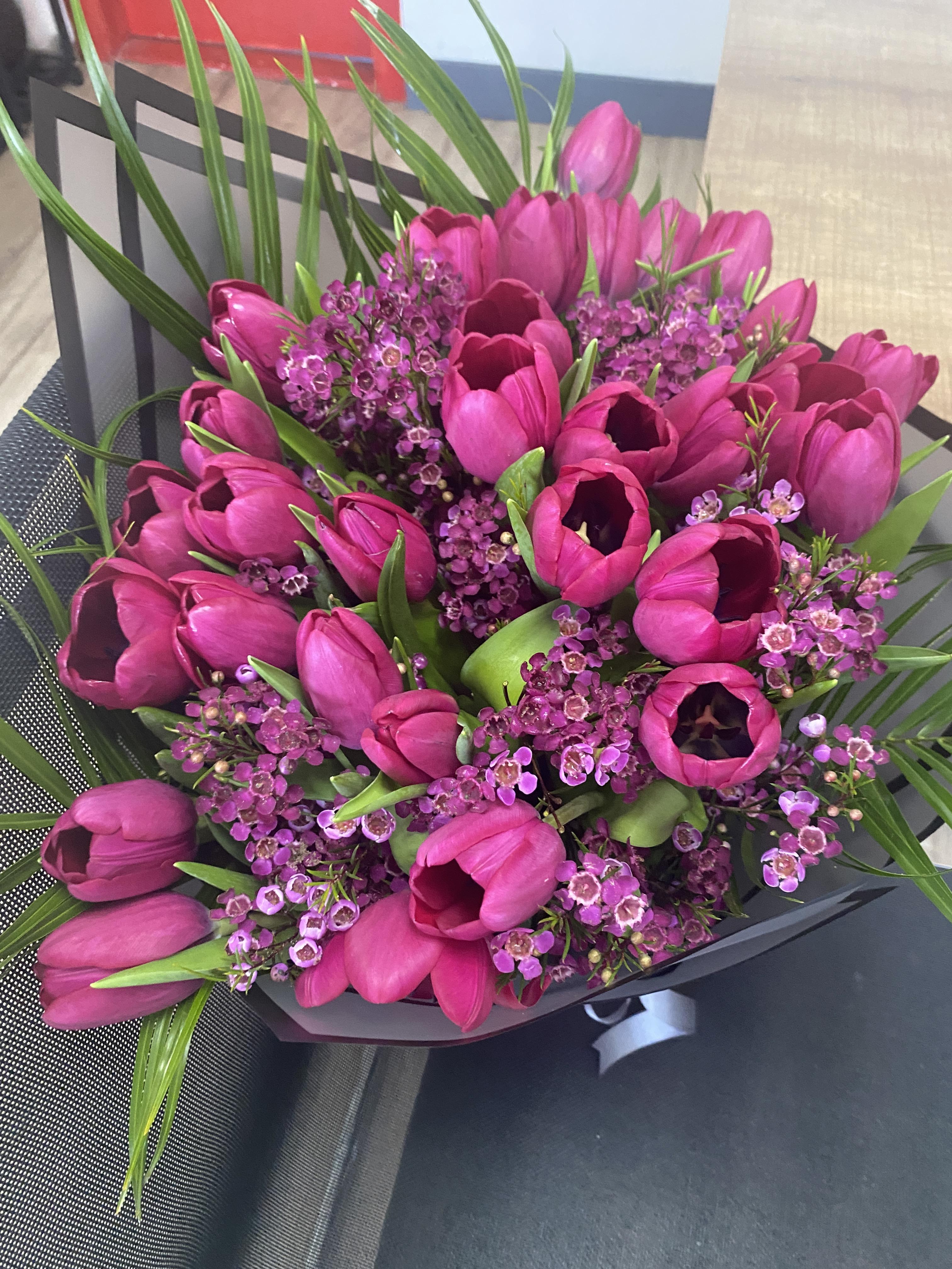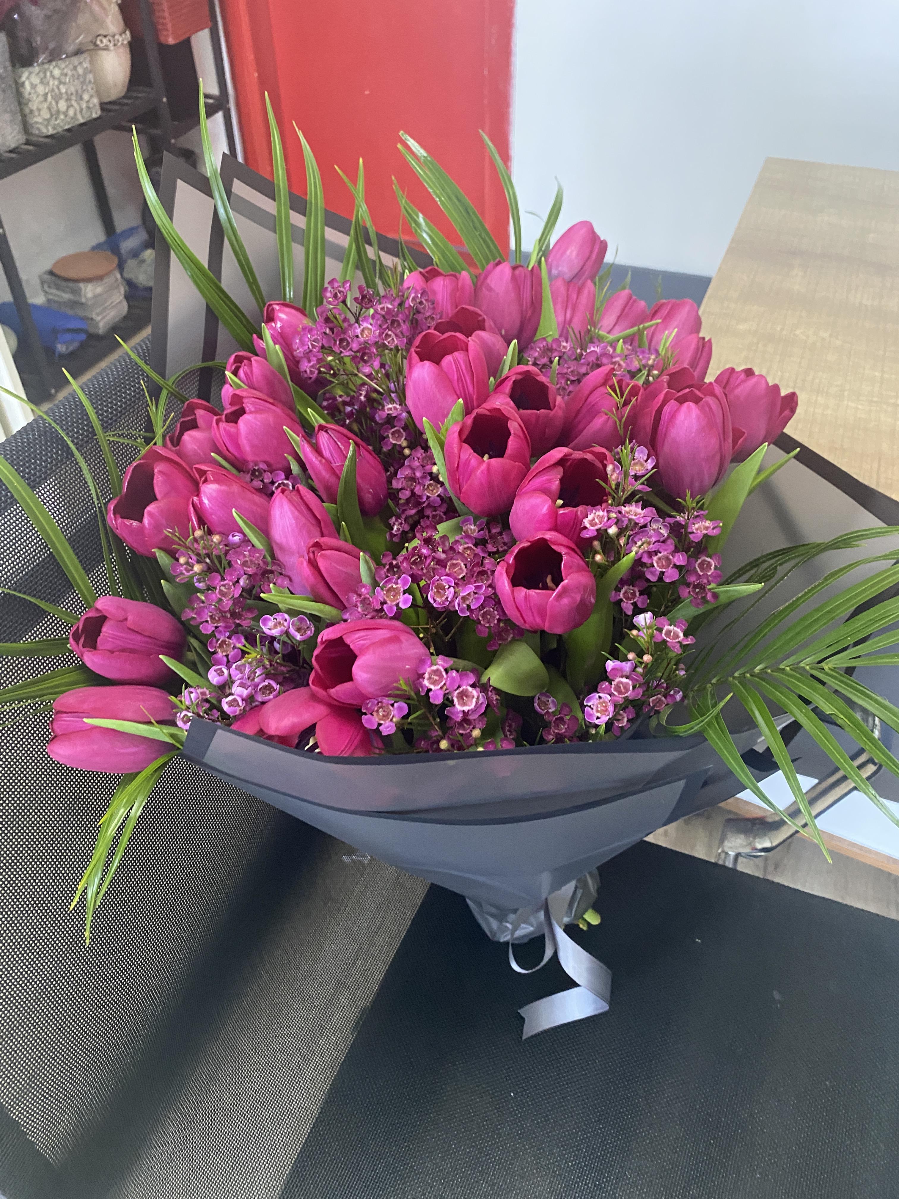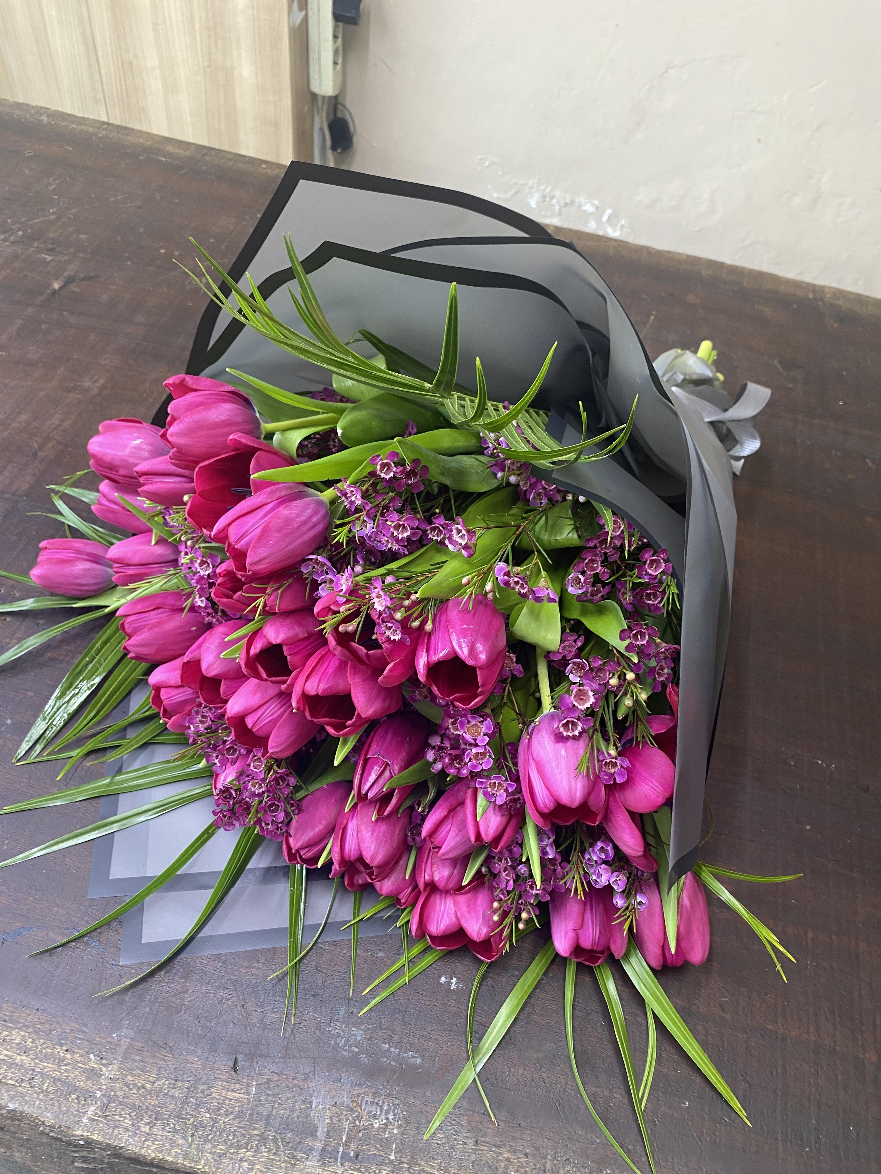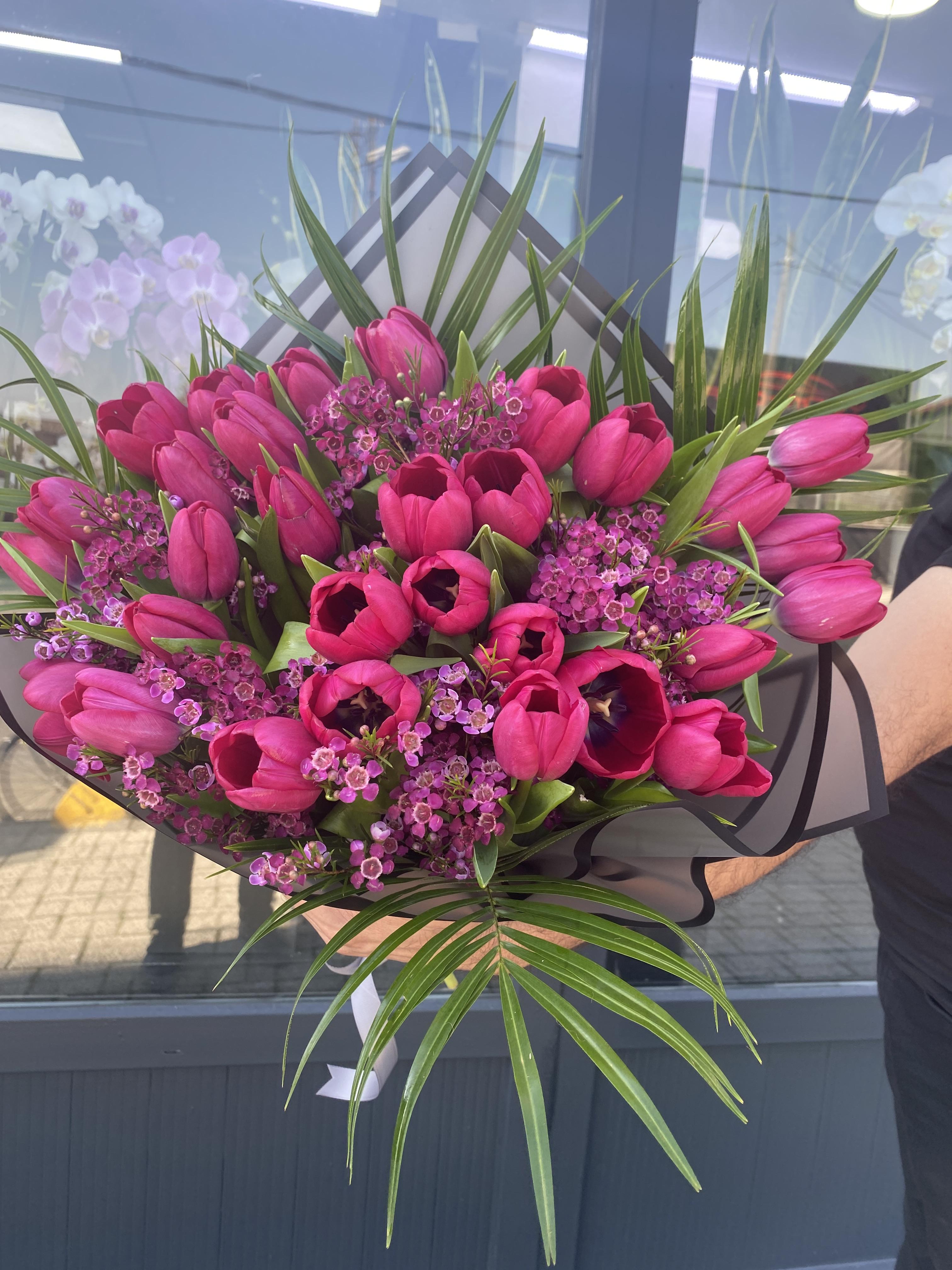 20 Adet Fuşya İthal Lale ve Chamelacium dan Buket..
