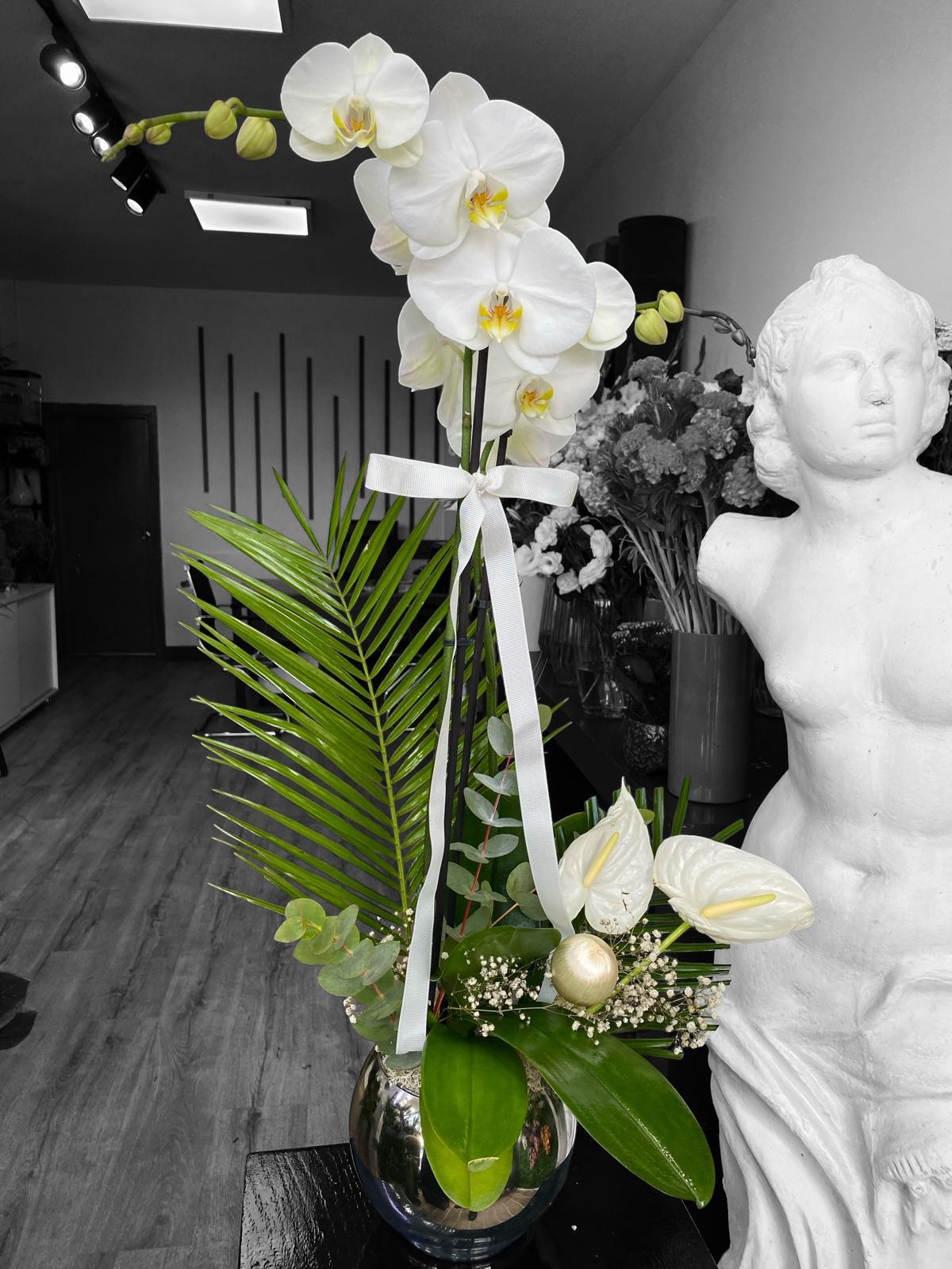 Gümüş Cam Vazoda Çift Dal Orkide