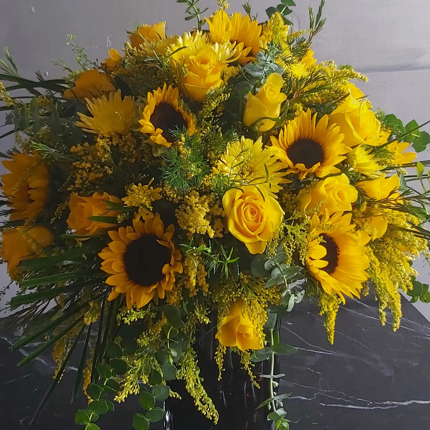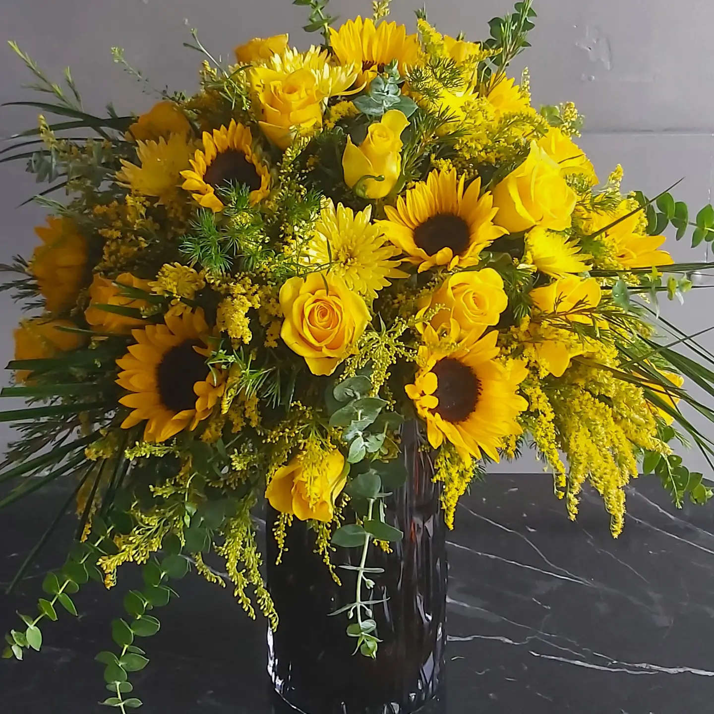 Paşabahçe cam vazoda, günebakan ve sarı gül aranjmanı.